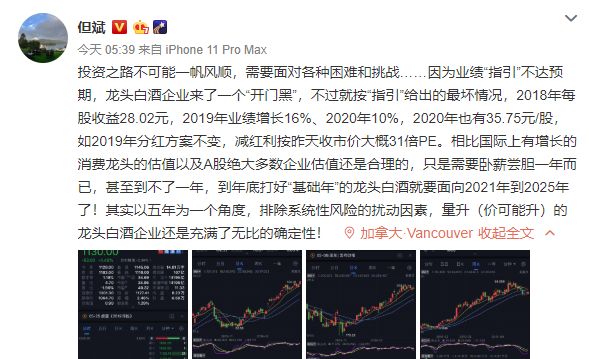 一直关注并投资茅台的私募大佬但斌也在其微博中力挺道:“龙头白酒所谓‘业绩’不达预期,开门黑,成交量巨大,估计国内基金和投资者跑路的多,其实1年、2年的业绩很难说,但放到五年就知道该怎么做了。国外基金的五年考核期是非常有道理的!”