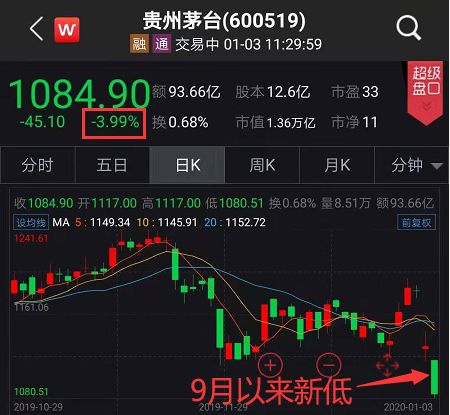 1月3日早盘,贵州茅台延续昨日跌势,跌破1100元,刷新2019年9月以来新低。